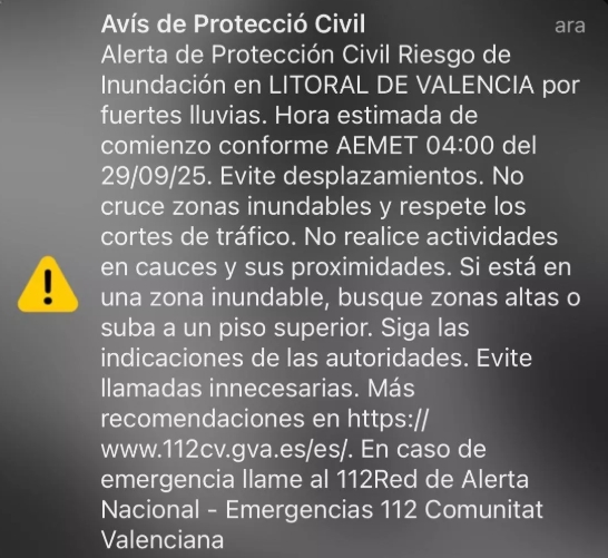 La Generalitat Valenciana ha activado de forma preventiva la Alerta Roja por lluvias intensas, empleando el sistema de aviso masivo EsAlert a las 15:28 horas del domingo, con una anticipación de más de 12 horas antes de que el riesgo extremo comience. Este es el primer uso de la alerta en diez meses.