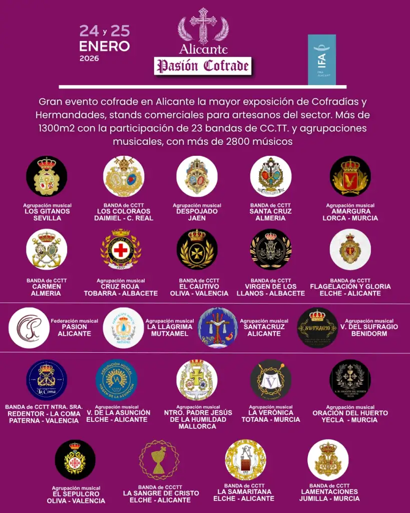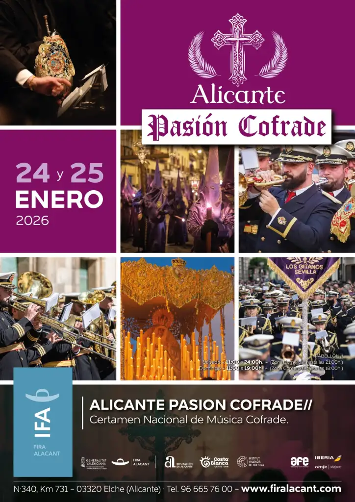 Alicante acogerá en 2026 la I edición de la feria “Alicante Pasión Cofrade”, un evento con el que se pretende reconocer y proyectar la Semana Santa alicantina, prestando especial atención a la música procesional asi como a las celebraciones de religiosidad popular de la Comunidad Valenciana, Cuenca, Albacete y Murcia declaradas de Interés Turístico Internacional, Nacional y autonómico, en este caso valenciana.
